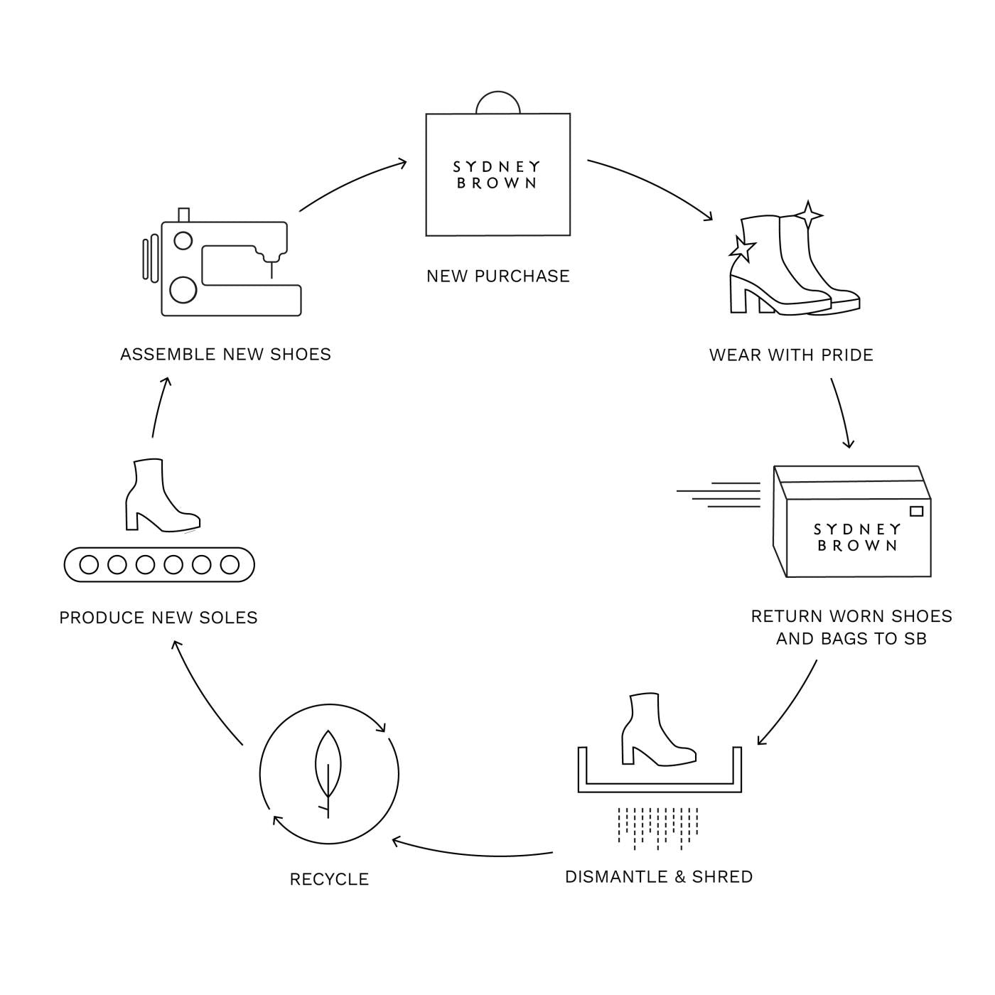 Our one of a kind, closed-loop recycling program collects worn shoes and bags, dismantles, shreds and uses their waste to create brand new soles.